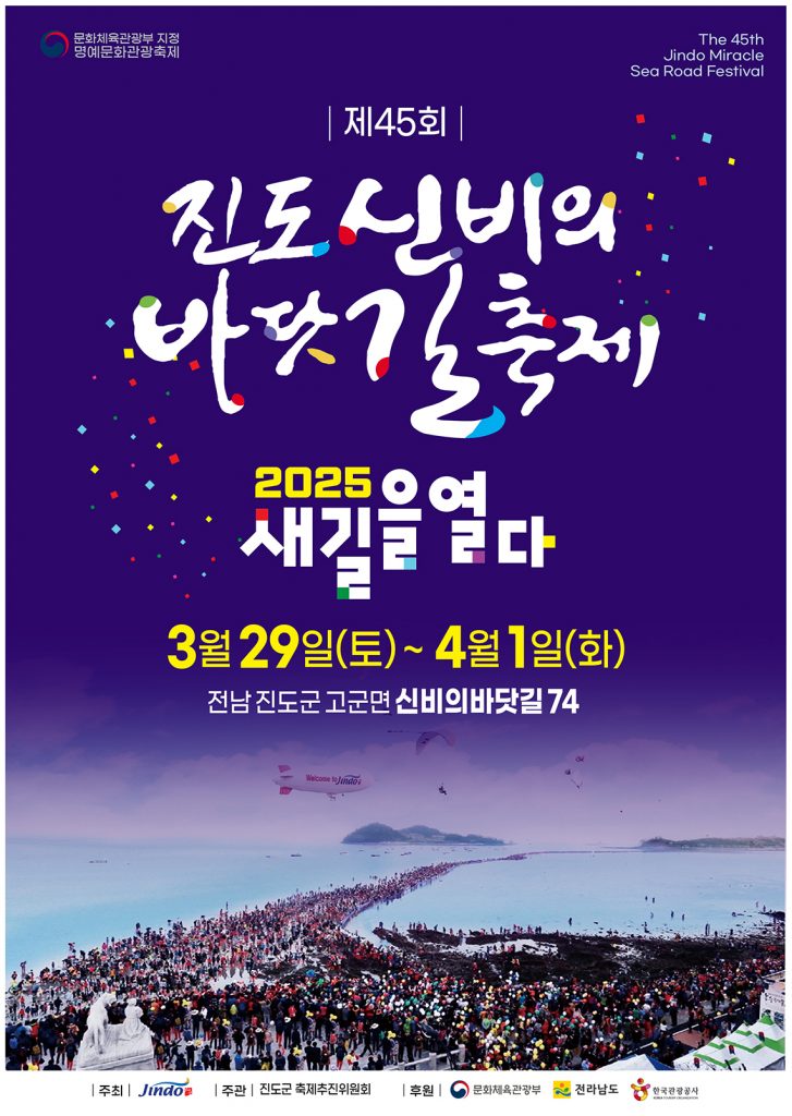 La région du Jeollanam-do acceuil chaque année après le dernier jour de février du calendrier lunaire, une grande marée qui ouvre une voie miraculeuse qui relie les îles de Jindo et Modo pendant une heure. La route mystérieuse, longue de 2,8km est un patrimoine culturel immatériel de Jindo.