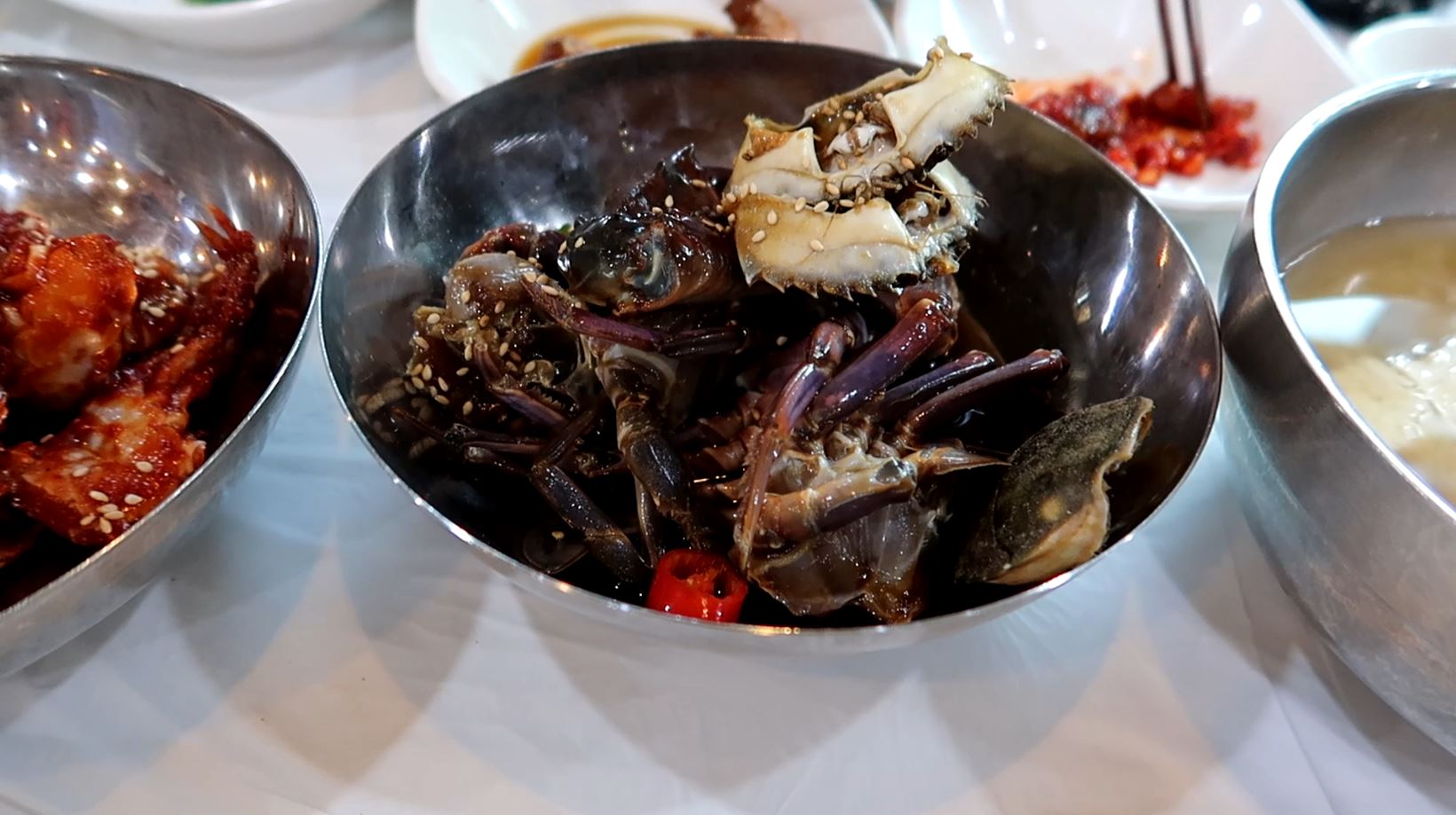 La spécialité locale est le crabe cru mariné dans de la sauce soja. C’était donc un passage obligé pour notre dîner :