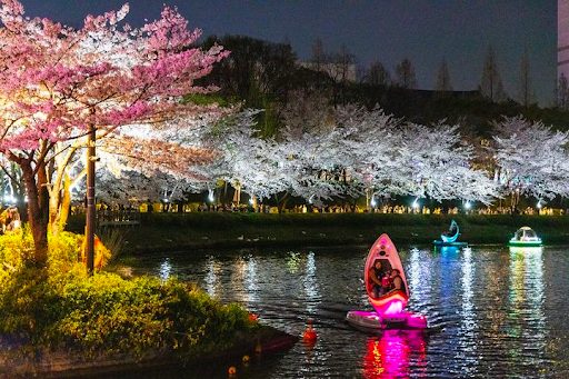 Parc d’attractions décoré de milliers de fleurs avec les cerisiers et illuminations nocturnes