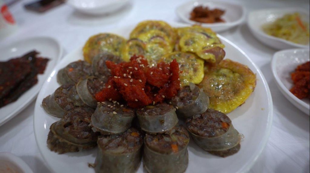 Vous y trouverez donc des spécialités nord-coréennes comme le Ojingeo Sundae(오징어순대) à base de poulpe et de boudin coréen :