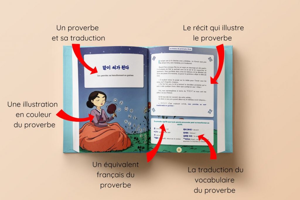 Pour vous transmettre cette aventure, ce sont 109 pages tout en couleur illustrée par Magali, une talentueuse illustratrice française; qui contiennent les 50 proverbes coréens les plus couramment employés sous la supervision de Namin, une actrice coréenne.