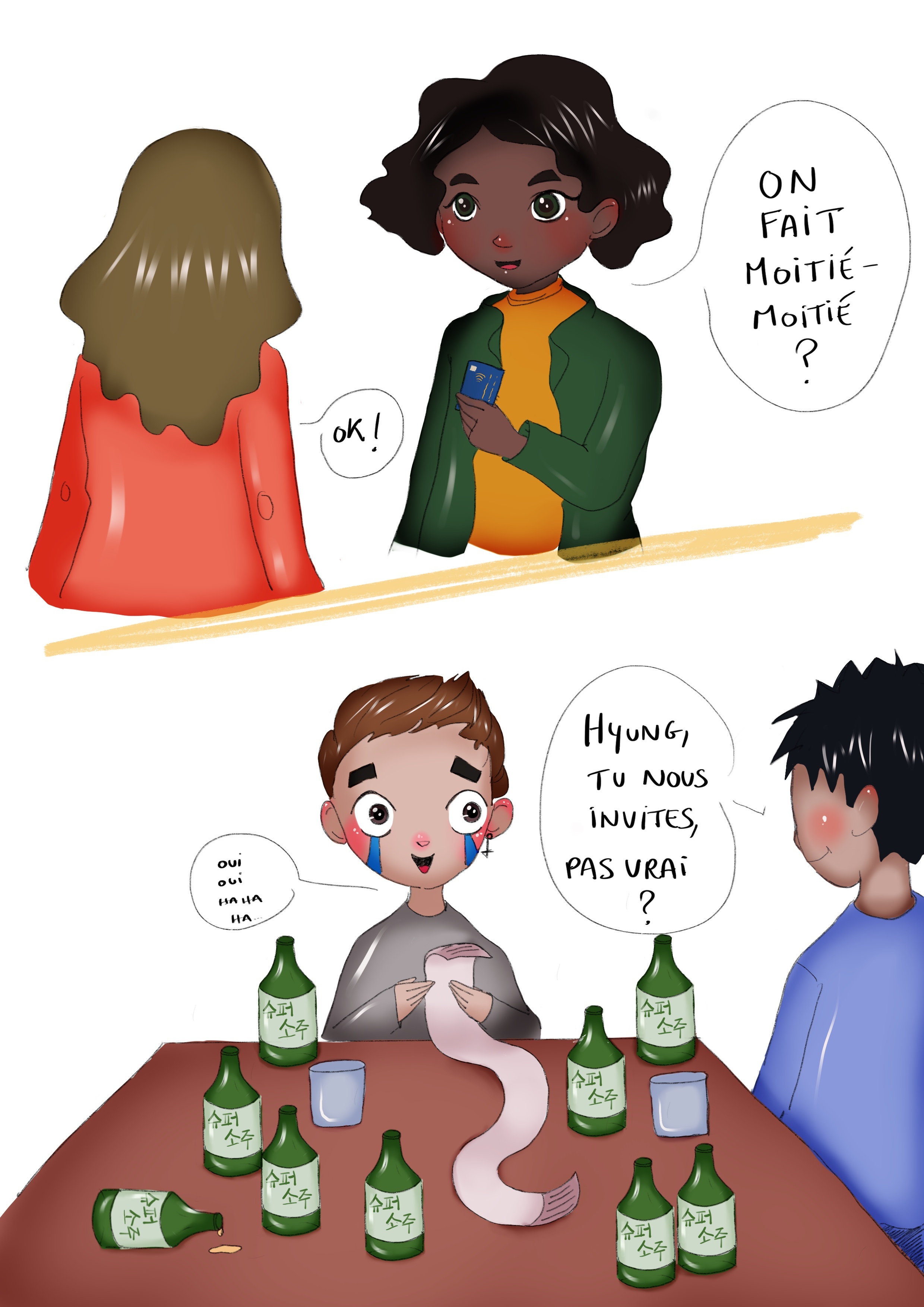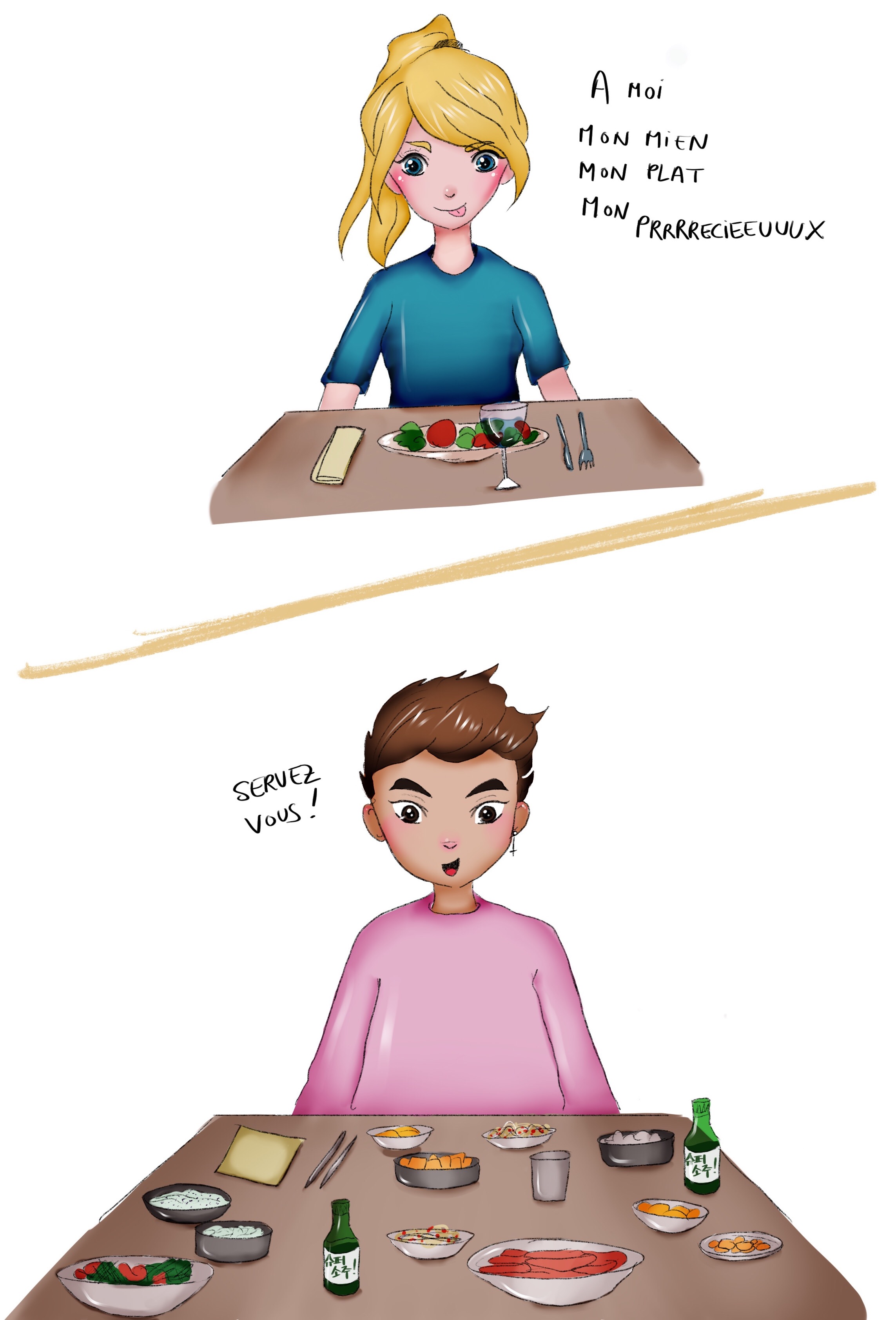 Une fois de plus, merci à Juliette de Blue Kimbap pour cette deuxième collaboration et ses dessins toujours aussi magnifiques! Vous pouvez en retrouver d’autres sur son blog illustrant des situations de la vie en Corée :