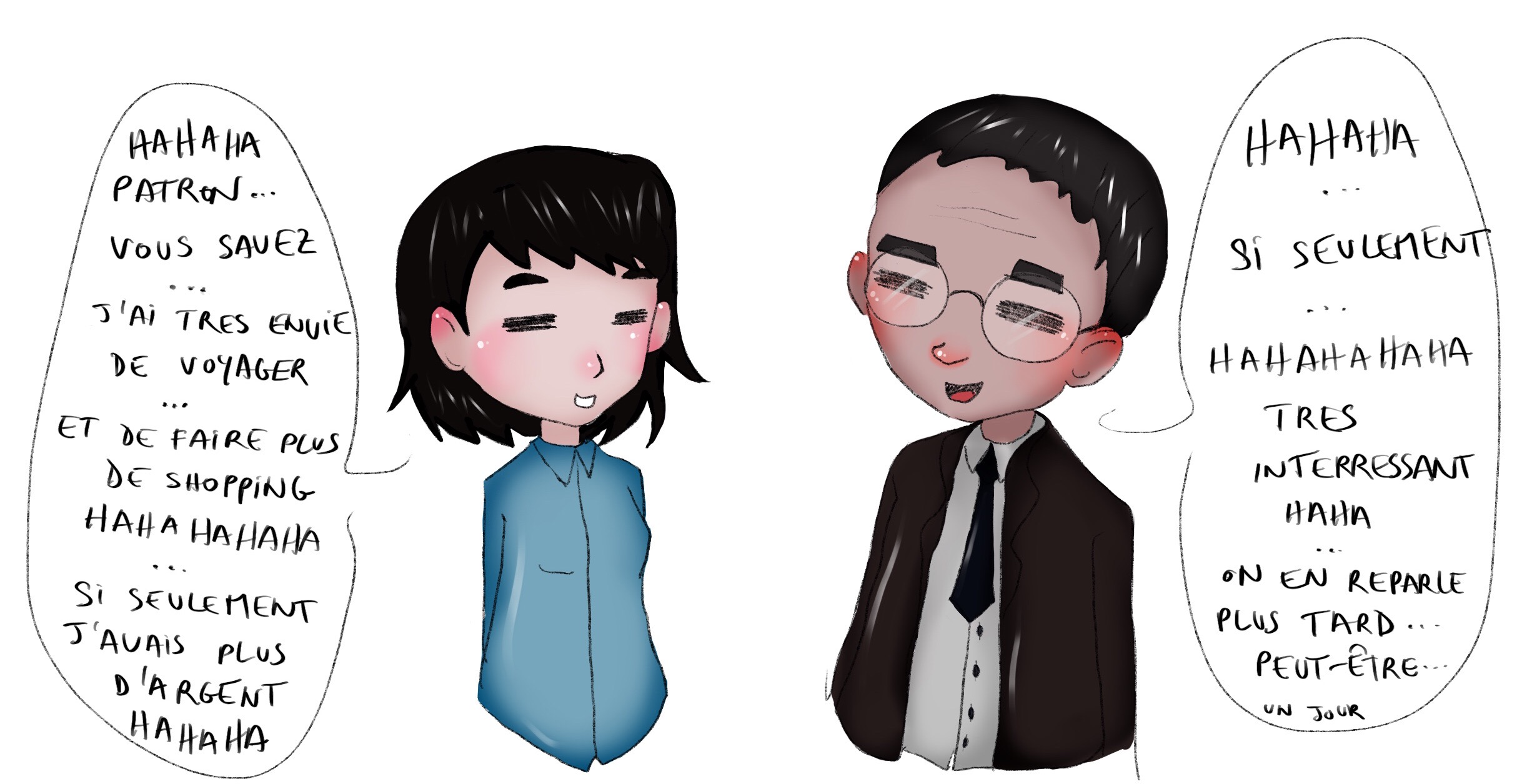 Par exemple une collègue de travail m’a raconté comment son entretien annuel s’était passé. Elle était censé demander une augmentation et ça ressemblait un peu à ça :