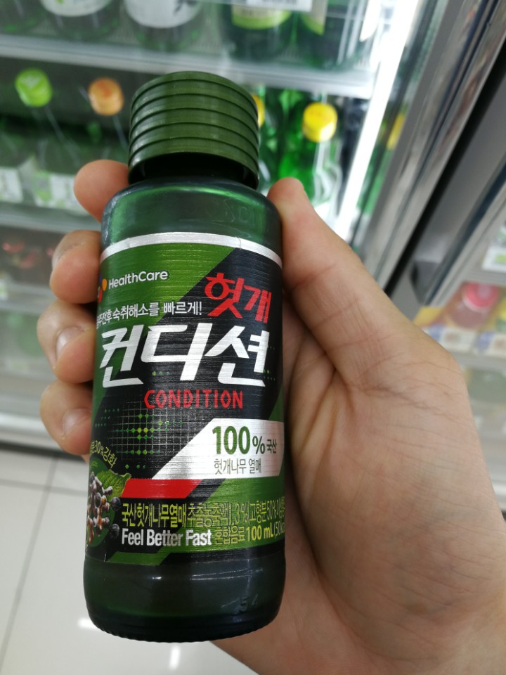Condition (컨디션) est comme sont nom l’indique une boisson qui vous met en …condition de boire ? En tout cas, cette boisson marche très bien auprès des jeunes grâce à la promotion qu’en font certaines célébrités de KPOP dont PSY. Cette boisson contient également du jus de raisin de Chine appelé Heotgae, connu comme remède traditionnel de la gueule de bois.