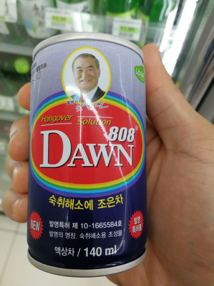Dawn 808 (여명808) est un autre remède à prendre avant de commencer à s’en mettre plein le foie… Fait à 100% d’herbes (c’est le Ajusshi sur la canette qui le dit!) il vous aidera à mieux faire face aux lendemains de cuite difficiles.