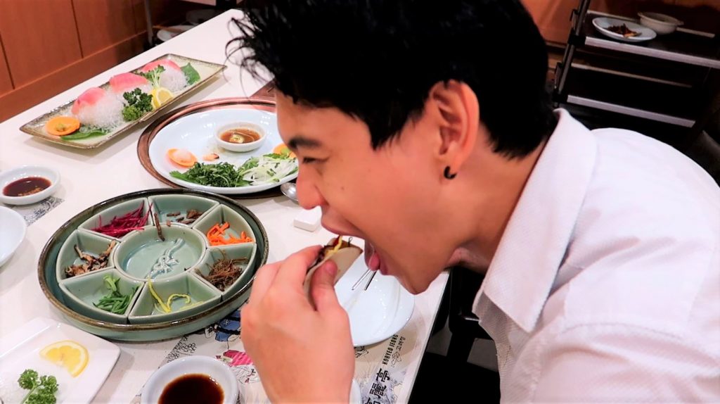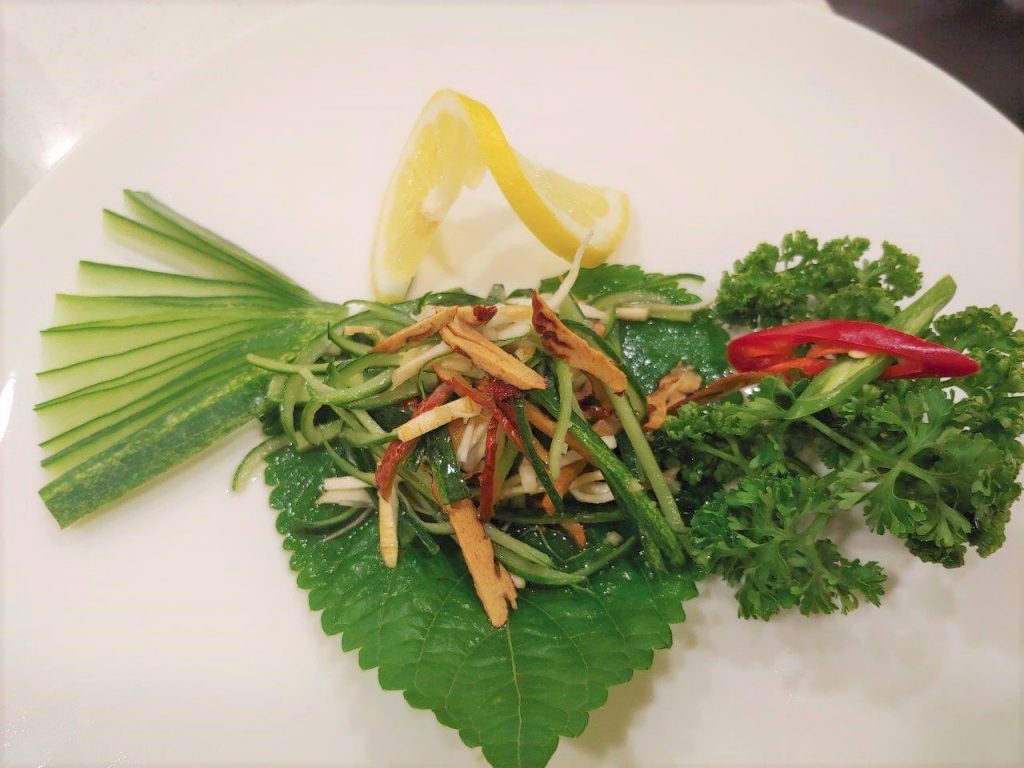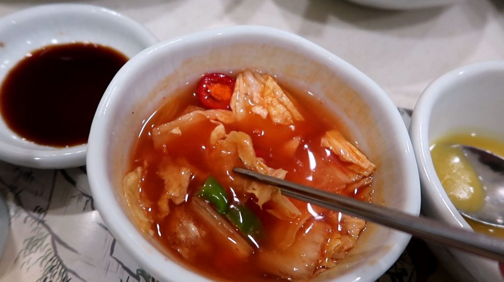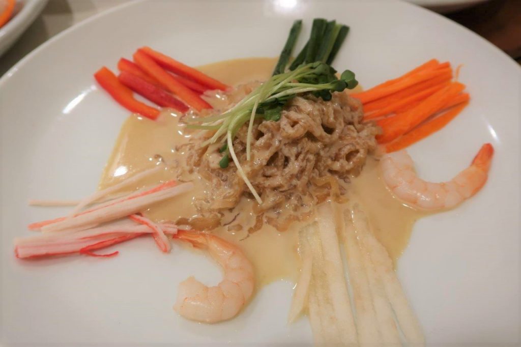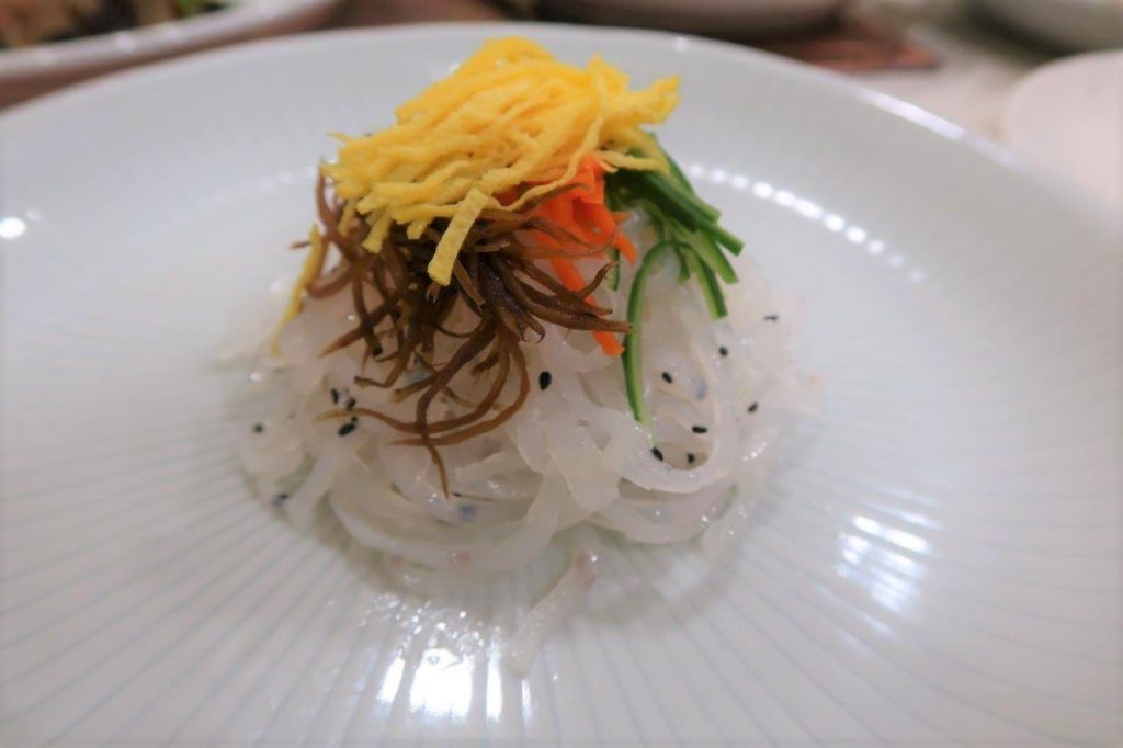 Le plat suivant était tout nouveau pour moi et vous allez comprendre pourquoi. C’est une salade à la méduse dans une sauce à la moutarde… Je me suis dit que j’allais mourir empoisonné par la méduse mais en fait il existe beaucoup d’espèces de méduses comestibles. Ouf ! Pour ce qui est du goût, c’est un peu caoutchouteux et ça ressemble à du poulpe. Je ne suis pas un grand fan mais c’était à tester, je peux maintenant dire que j’ai déjà mangé une méduse.