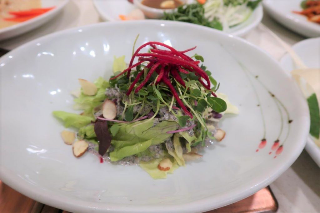 On attaque ensuite sainement avec une salade avec de la sauce de sésame :