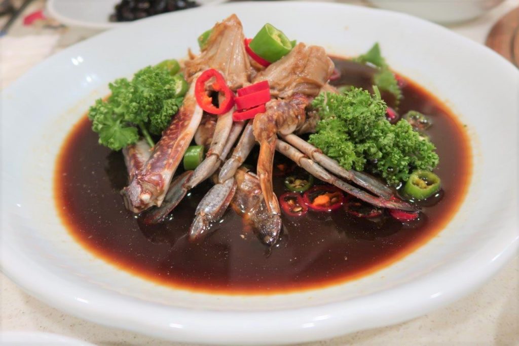 Je commençais déjà à être un peu rempli mais je n’allais pas abandonner ici bien sûr en sachant que d’autres plats délicieux allaient arriver. Et celui-ci peut parfois faire peur. Moi-même, je ne l’ai pas apprécier la première fois mais après plusieurs tentatives, je suis finalement devenu un grand fan : le crabe bleu cru mariné dans de la sauce soja. C’est un plat dont les japonais, chinois et coréens raffolent. Ce plat seul coûte déjà très cher en général ( 45,000 wons dans la plupart des restaurants spécialisés dans le crabe bleu cru).