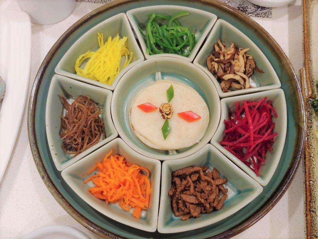 Puis vient le tour de ce plat que vous avez peut-être déjà vu lors des repas de noces. Normalement, c’est le Gujeolpan ( qui signifie assiette de 9 délices) qui est servi lors d’un repas royal coréen. Le plat est composé de 9 compartiments dans lequel se trouve une sorte de crêpe coréenne accompagnée de légumes, champignons et de viande. Dans mon menu, c’est une version plus light que j’ai eu avec 8 compartiments :