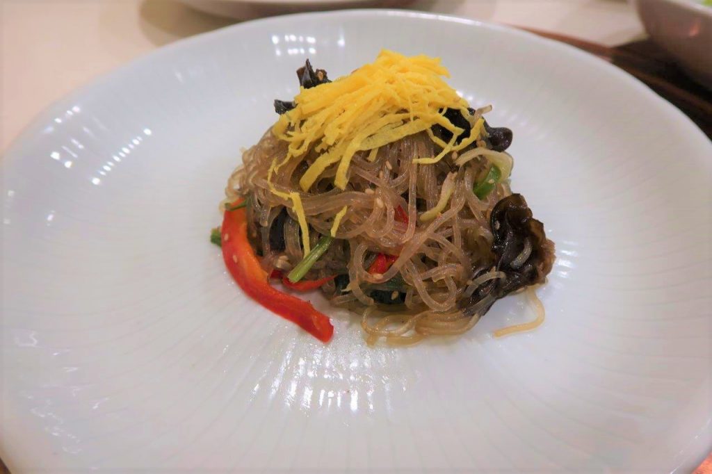 Par contre, le troisième plat,…il s’est volatilisé en 3 bouchées. C’est le fameux Japchae qui est un plat composé de nouilles de patate douce et de légumes qui se mange normalement lors des fêtes comme Seollal par exemple. C’est un de mes plats préférés et même si je me devais d’économiser de la place dans mon estomac, je n’ai pas pu m’empêcher de le finir :